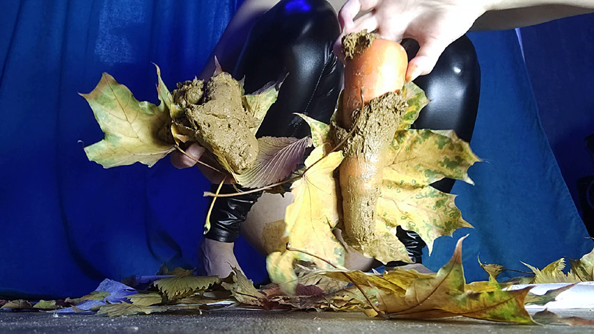 Wanting to be a dirty girl, and because I simply can't help myself, I eagerly grabbed my big carrot dildo, desperate to fuck myself in the ass. It's a very similar feeling to pushing out a big shit, a feeling I can't get enough of. Without a doubt it's the sexiest feeling ever! I stopped briefly to wrap my shit in the colorful autumn leaves, but then I wanted more. Leaning back with my legs apart and lifted high in the air, I rammed the dildo back into my ass where it belonged!