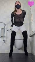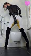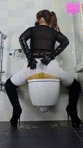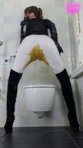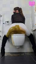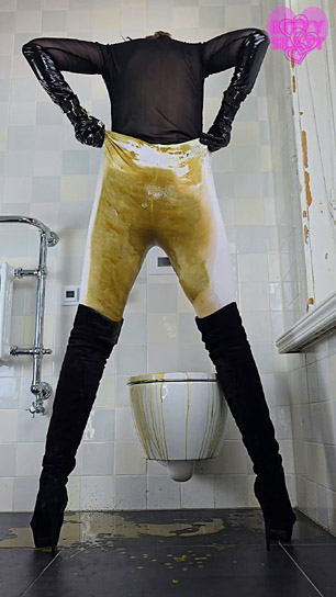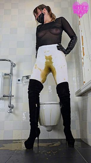 My hands bound behind my back, I'm completely unable to pull down my leggings and lift the toilet lid. In total panic I look at you, begging, pleading. Screams muffled by the dildo gag, choking on it, boots clattering hard. It's too late, I can't hold it in anymore. An enormous explosion of brown liquid shit fills my white leggings and down into my suede boots. My knees shaking, I helplessly drop onto the huge massive on the toilet lid. I feel my pussy pulsing, I'm strangely turned on. Extremely turned on actually... Overwhelmed by my shameful lust I start grinding my hips into the toilet, humping it faster and faster. My handcuffs finally break after many desperate tugs.